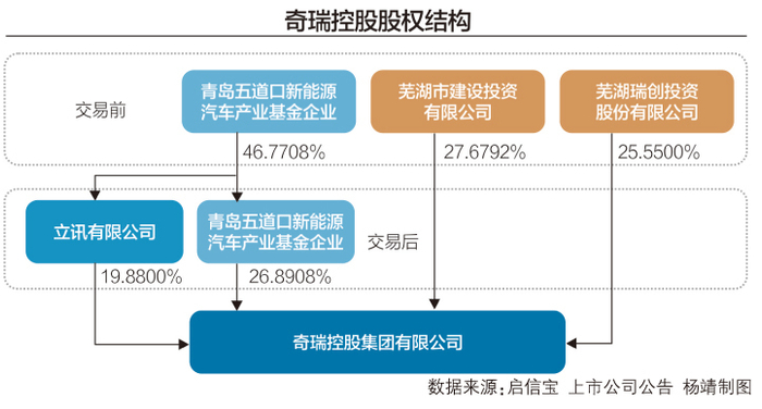 交易完成后,立讯有限不对奇瑞控股、奇瑞股份及奇瑞新能源构成控制。同时,青岛五道口持有的奇瑞控股46.77%股权降至26.89%,将从第一大股东的位置成为第二大股东,低于芜湖市建设投资有限公司(芜湖市国资委全资控股)27.68%的持股比例。