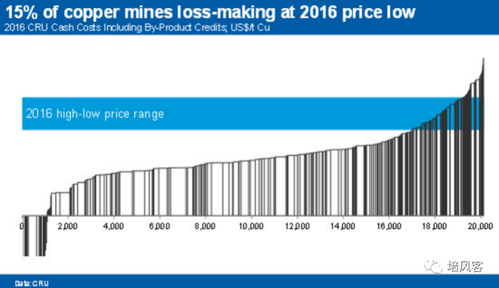 横坐标是产能,纵坐标是成本,全世界在2016年需要2000万吨铜,所以每一个柱状图代表了一个矿山,矿山越大,柱状图越粗,矿山成本越低,柱状图越短。任何一个商品的供需平衡表都是这样被塞满的。如果你成本很低,那么你就在这个图的左侧,不管需求怎么变化,是2000万吨还是1900万吨,你都可以在里面。