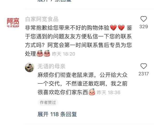 随即品牌官方账号“白家阿宽食品”给留言致歉:“非常抱歉给您带来不好的购物体验,鉴于您遇到的问题,友友方便私信一下您的联系方式吗?阿宽会第一时间联系售后专员为您处理 ” 。