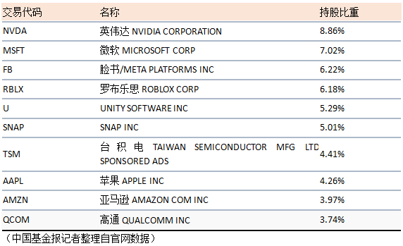 而从该ETF构建的元宇宙概念投资组合显示,前十大持仓股均为全球大型科技公司和芯片制造商,包括Meta、Roblox、英伟达、Unity、苹果、Snap、AMD、高通、索尼、腾讯。