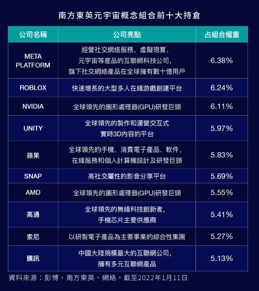 其中,占组合权重最大的是在元宇宙下了重注的Meta(原Facebook),占比达到6.38%。不过,2月3日,Meta发布2021年第四季度及全年未经审计财报,元宇宙成为Meta持续烧钱的“黑洞”。同时,年初至今,Meta股价跌幅超过35%。