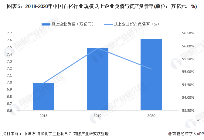 中国石化行业规上企业资产负债率维持在54%-56%的区间,处于较为合理的范围。资产负债率55.1%,同比下降0.6个百分点。行业负债7.61万亿元,负债规模同比有所增加。