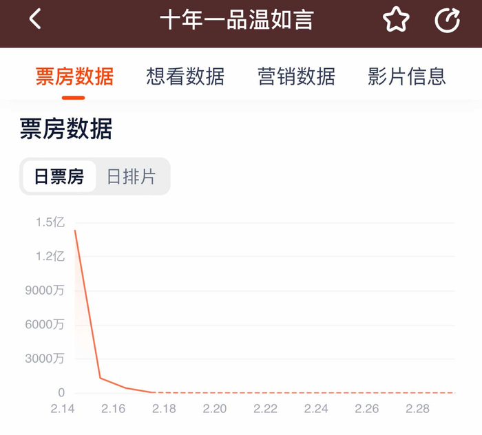 宣传造势带来的繁荣是短暂的。不出意料,首日之后,《十年一品温如言》的票房和排片量都出现断崖式下降。尤其是票房,从2月14日至2月16日几乎以10倍速度大跳水。从第一天的1.43亿元,直线下降至第二天的1304万元,到了第三天票房仅约425万......