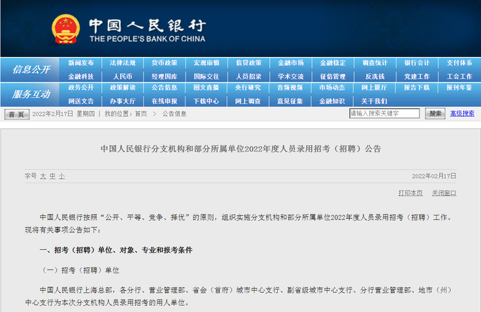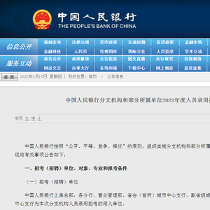 2月17日,据中国人民银行官网消息,中国人民银行分支机构和部分所属单位2022年度人员录用招考(招聘)公告发布。