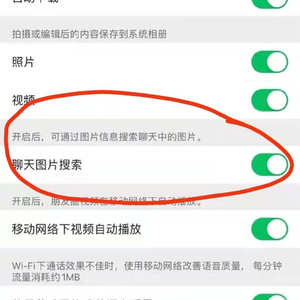 在最新的微信iOS版本中,依序点击“设置”→“通用”→“照片、视频、文件和通话”,开启“聊天图片搜索”,即可使用新增的“聊天图片搜索”功能。