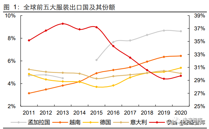 2021 年 1-5 月:第三大服装出口国孟加拉政府防疫管控较严,其服装出口承压;期间越南和中国形成出口替代,但并不显著。