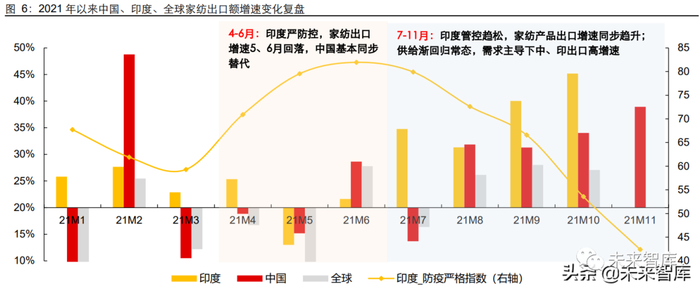 2021 年 7-11 月:印度防疫政策严格综合指数逐月下降,其家纺出口迅速回升,订 单外流并不具备惯性。伴随供给端重回平衡,需求主导下,中国、印度出口增速逐 月提升。