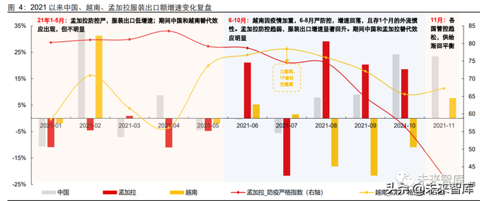 2021 年 6-10 月:越南疫情加重下 6-8 月严防控,服装增速回落,且存 1 个月的外 流惯性,越南订单外流历时 4 个月(7-10 月),超过防疫严格处于 75 以上的 3 个 月(6-8 月);期间伴随孟加拉的防控趋弱,中国和孟加拉替代效应明显。