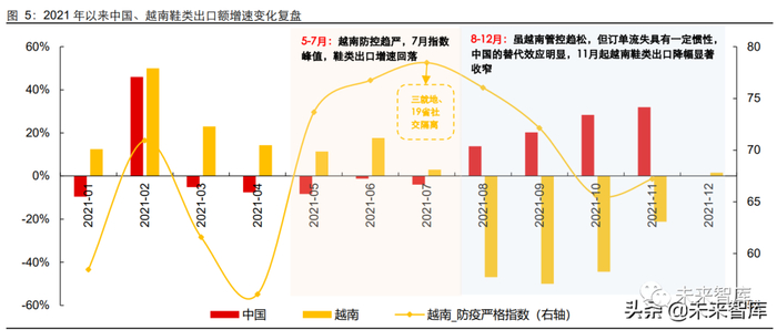 2021 年 5-7 月:越南防疫政策严格综合指数趋升,7 月越南政府要求南部企业“三 就地”,且当月对南部 19 省实施封闭。7 月其鞋类出口增速回落,但中国的替代效 应不明显,预计与品牌转单存在一定周期、越南制造商存货冲抵等有关;