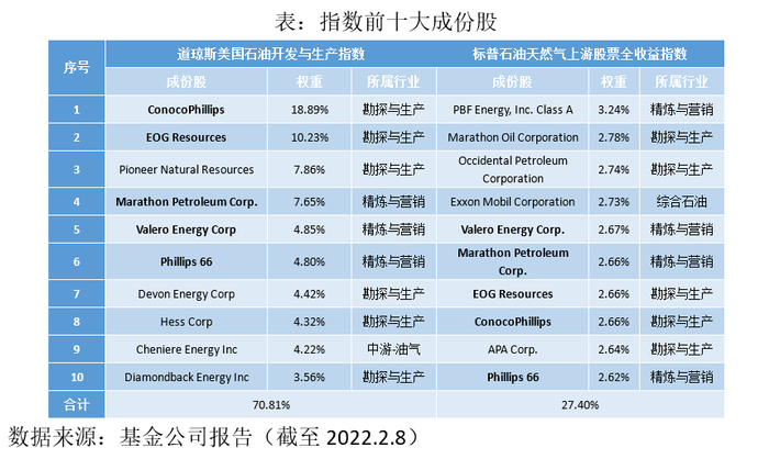 从与油价的相关性来看,由于成份股中上游勘探及生产的企业更多,道琼斯美国石油开发与生产指数以及标普石油天然气上游股票全收益指数与国际油价的相关系数更高。而从指数成份股来看,两只指数几乎完全一致,有47只成份股相同。其中前十大成份股中有五只成份股相同。