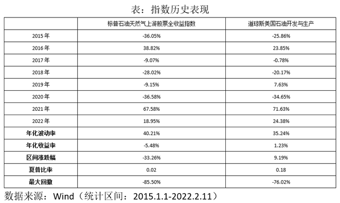 虽然道琼斯美国石油指数与标普石油天然气上游股票指数成份股几乎相同,但由于权重分配的差异,导致道琼斯美国石油开发与生产指数的历史表现要远远好于标普石油天然气上游股票指数。自2015年初到2022年2月11日收盘,道琼斯美国石油开发与生产指数累计取得9.19%收益,年化收益率为1.23%,明显好于标普石油天然气上游股票全收益指数。并且从分年度收益率来看,道琼斯美国石油开发与生产指数8年里面有7年战胜标普油气指数。