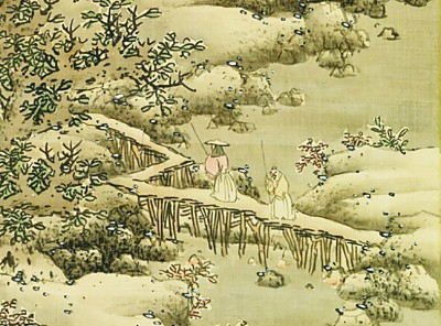 踏雪寻梅的典故早为国人所熟知。宋人孙光宪在《北梦琐言》卷七记载:唐代郑綮颇有诗名,作诗的灵感靠风雪来激发。有人问他:相国近有新诗否?他说:“诗思在灞桥风雪中驴子上,此处何以得之?”明人则多指称孟浩然,程羽文在《诗本事·诗思》记载:“孟浩然诗思在灞桥风雪中驴子背上。”于谦有诗《题孟浩然踏雪寻梅》:“满头风雪路欹斜,杖屦行寻卖酒家。万里溪山同一色,不知何处是梅花。”张岱在《夜航船》中解释“踏雪寻梅”:“孟浩然情怀旷达,常冒雪骑驴寻梅,曰:吾诗思在灞桥风雪中驴背上。”