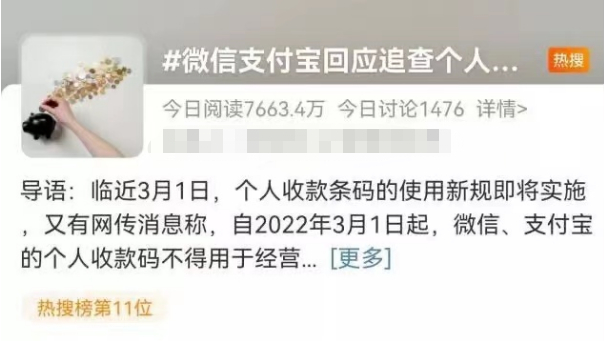 据媒体报道,近期有网络流传消息称,自2022年3月1日起,微信、支付宝的个人收款码不得用于经营性收款。不仅如此,近4年的数据将被追查,一旦数额较大需按4.5%补税,还要缴纳滞纳金和罚款。对此,微信和支付宝回应称,追查个人收款码近4年数据的说法为谣言。