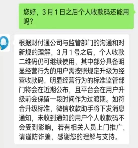 记者在询问腾讯客服个人收款码是否可以继续使用时,腾讯客服回复称,根据财付通公司与监管部门沟通和对新规的理解,3月1日之后,个人收款二维码仍可继续使用,其中部分具备明显经营行为的用户需按照规定升级为经营收款码。对于明显经营行为的标准,监管部门将会在近期公布,平台会在用户升级前保留一段时间作为过渡期。