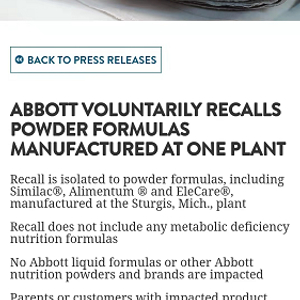 虽然雅培对成品的检测未发现病原体,但我们正在采取行动,召回在该工厂生产的奶粉,有效期为2022年4月1日或更晚。雅培的液体配方、粉末配方或其他工厂生产的营养产品都没有受到此次召回的影响。