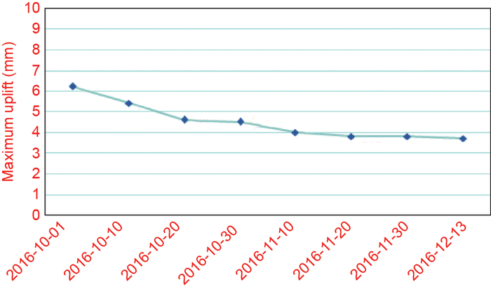 运营隧道左线的隆起与沉降相对变化量较大,最大隆起与沉降的时程曲线见图18和图19。