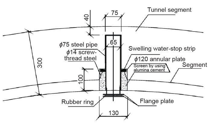 (1)管片开孔。管片开孔分两步进行,先在隧道正上部用取芯机打设一个外径为Φ130mm、深度为100mm的孔。此位置位于两个手孔中间;随后在同一圆心处打设外径Φ75mm、深度为160mm的孔(见图8)。
