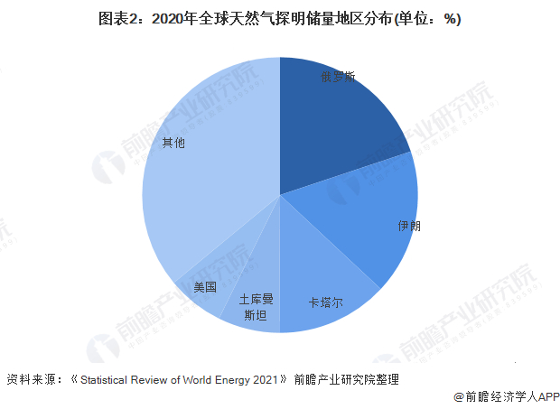 根据《BP世界能源统计年鉴2021》数据,2020年,全球天然气储量的前5强分别为俄罗斯(19.88%)、伊朗(17.07%)、卡塔尔(13.13%)、土库曼斯坦(7.23%)和美国(6.70%)。