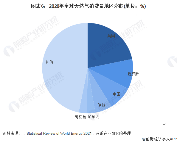 6、天然气消费量分布:美国消费了全球天然气资源的21.76%