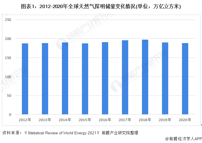 全球天然气储量有所下降。根据BP公司发布的《BP世界能源统计年鉴2021》披露的数据,2012-2020年,全球天然气储量呈现上升后下降态势。2019年,全球天然气已探明储量为190.30万亿立方米,较2019年下降3.45%。2020年全球天然气探明储量较2019年下降1.16%,至188.10亿立方米。