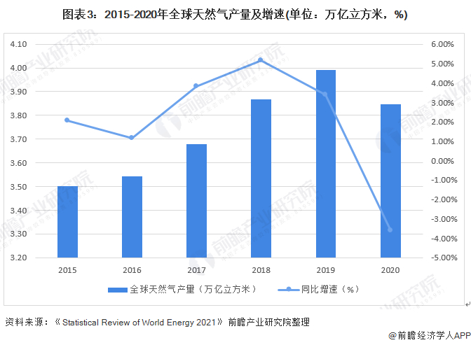 根据英国石油公司(BP)发布的《BP世界能源统计年鉴2021》统计数据显示,2015-2020年全球天然气产量呈增长趋势,增速呈波动趋势。2019年全球天然气产量为3.99万亿立方米,同比增长3.4%。2020年全球天然气产量下降3.6%至3.85万亿立方米。