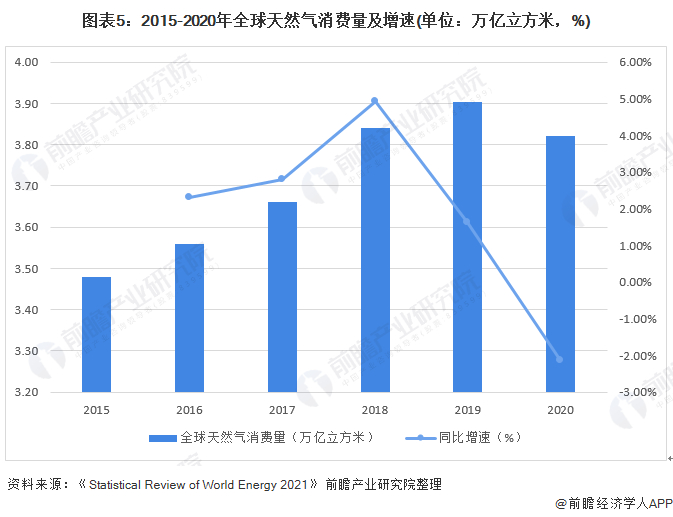 《世界能源统计年鉴2021》数据显示,2015-2019年全球天然气消费量呈增长趋势,2019年全球天然气产量为3.90万亿立方米,同比增长1.64%。2020年全球天然气消费量出现五年来的首次下跌,仅3.82万亿立方米,同比下降2.13%。