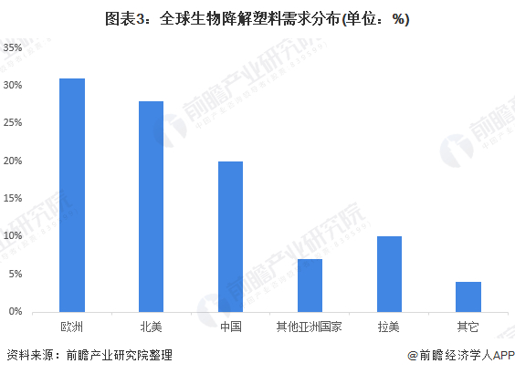 欧洲生物降解塑料市场快速发展主要得益于欧洲相关法律法规支持。全球生物降解塑料需求量中,欧洲的需求量最大,占比达31%,北美和中国占比分别为28%和20%。