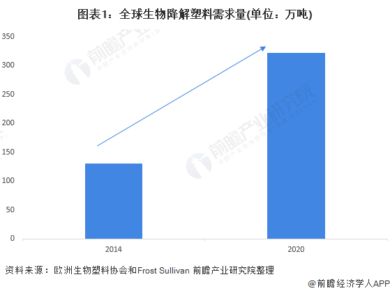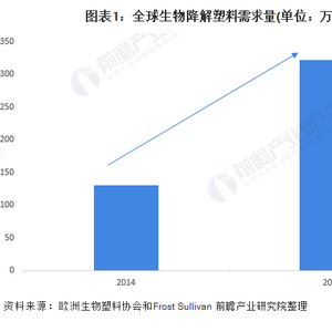 塑料污染的治理主要应从源头减量、回收、替代、清理四方面入手,其中用在自然环境中可降解的塑料替代传统塑料是上述治理工作的重要一环。因此全球生物降解塑料需求量呈较快增长趋势。欧洲生物塑料协会和Frost & Sullivan数据显示,2014年生物降解塑料需求130万吨,到2020年达到322万吨左右,年均增长率达到16.7%。