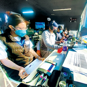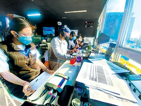冬奥赛场上,体育展示团队通过音频、视频、投影等形式,营造热烈的赛场气氛。图为体育展示团队正在工作。(北奥集团供图)