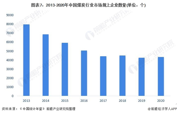 依据历年《中国统计年鉴》的数据来看,2013-2020年,中国煤炭行业规上企业数量呈下降趋势。行业主题数量规模逐年精简,到2020年,煤炭行业的规上企业数量下降至4331个。