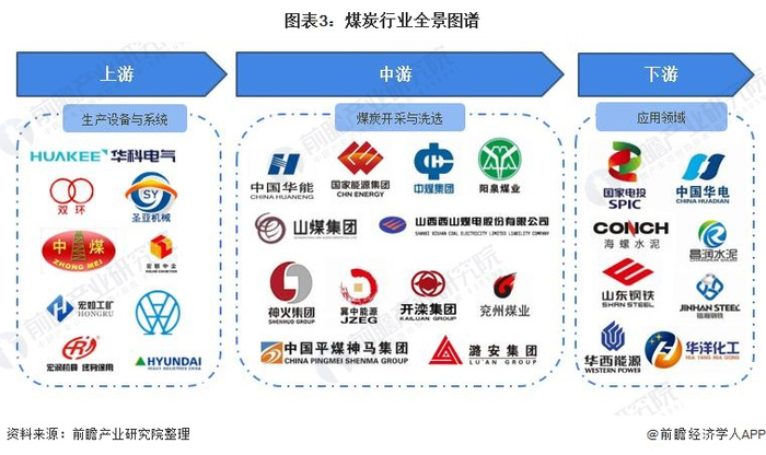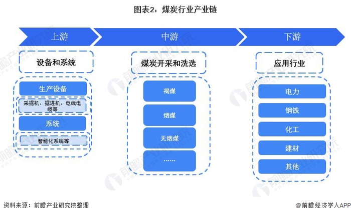 煤炭行业产业链上游为设备和系统,主要包括采掘机、掘进机等生产设备以及相关的智能化系统;中游为煤炭开采和洗选,主要煤种有褐煤、烟煤、无烟煤等;下游为应用领域,主要包含电力行业、钢铁行业、化工行业以及建材行业四大类行业。