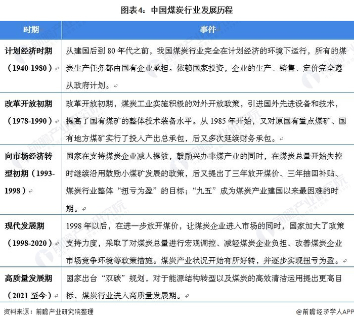我国煤炭的有序发展可追溯至计划经济时期,建国后由国家规划发展,后随着改革开放的深入以及市场经济的转型,我国煤炭行业逐渐实现市场化。近年来,我国煤炭行业基于能源转型的需求,迈入高质量发展阶段。