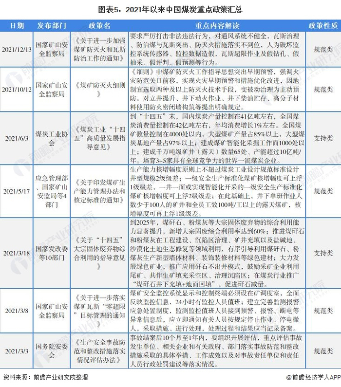 2021年以来,国务院、国家发改委、能源局、矿山安全监察局等多部门陆续印发了支持、规范煤炭行业的发展政策,内容涉及煤炭行业历年的发展目标、煤炭开采的安全性建设、煤炭的清洁与智能化利用等方面: