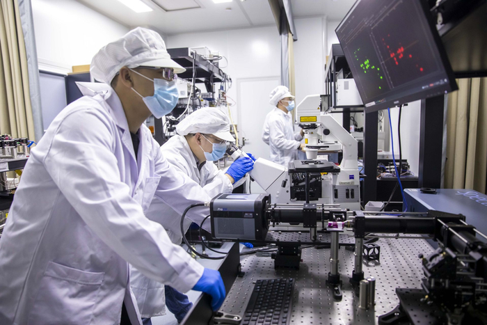 粤港澳(国际)青年创新工场,研究人员在现代精密光学与太赫兹实验室内做实验。