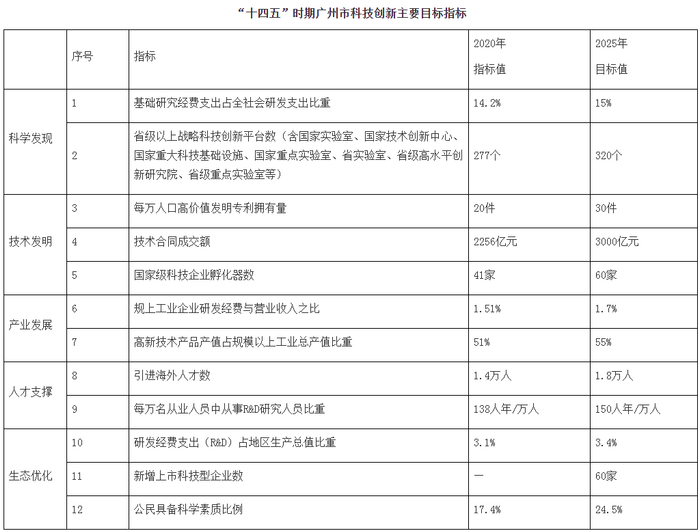 瞄准“创新策源能力显著增强”。广州要在共建粤港澳大湾区国际科技创新中心和大湾区综合性国家科学中心取得重大进展,科技创新平台体系建设全面提速,国家实验室、国家技术创新中心建设有新突破,省级以上战略科技创新平台数达320个,在若干重点领域产生一批具有重要影响力的重大原创成果。基础与应用基础研究整体水平和国际影响力大幅提升,基础研究经费支出占全社会研发支出比重提升至15%。
