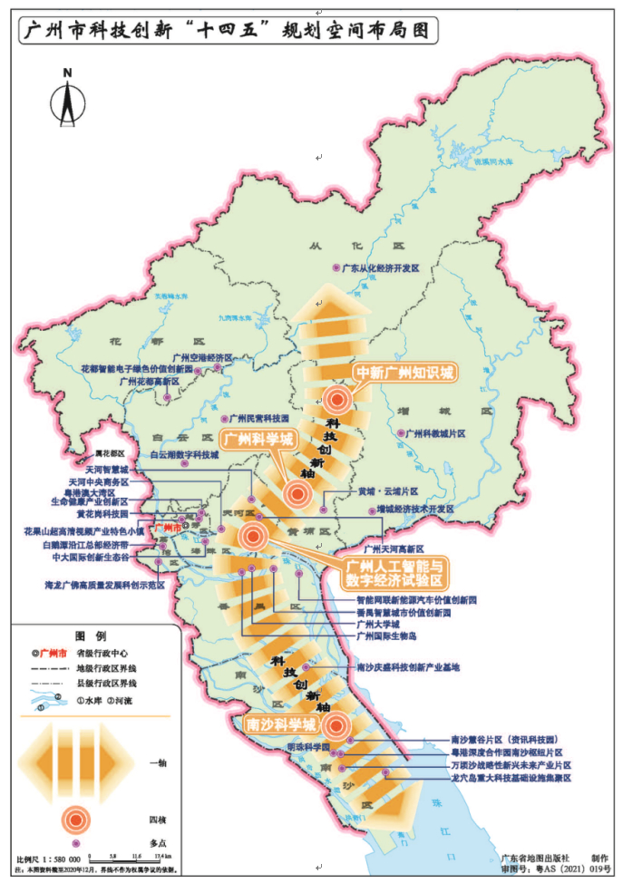 一轴:即科技创新轴。以中新广州知识城和南沙科学城为极点,链接广州科学城、广州国际生物岛、广州人工智能与数字经济试验区、天河智慧城、广州大学城、白云湖数字科技城、南沙庆盛片区、明珠科学园等全市域科技创新关键节点,打造科技创新轴。