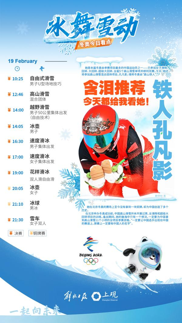 2月19日,距离北京2022年冬奥会闭幕还有一天,赛事进入最后阶段。这一天,将在冰壶、冰球、高山滑雪、花样滑冰、速度滑冰、雪车、越野滑雪、自由式滑雪等项目产生9枚金牌。