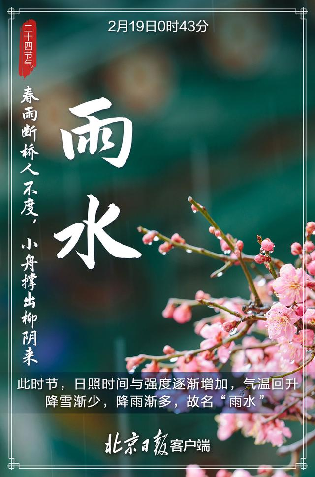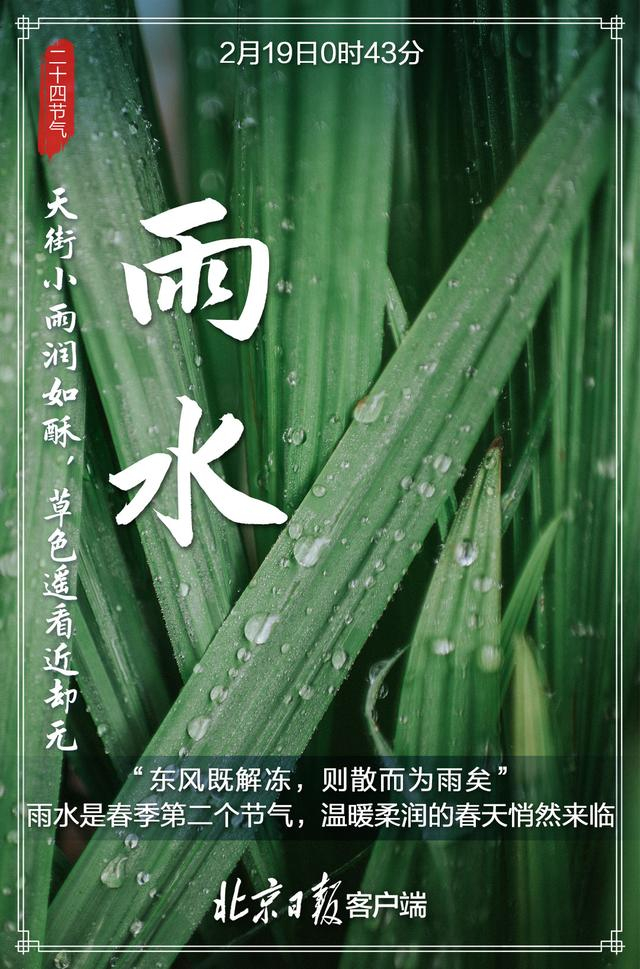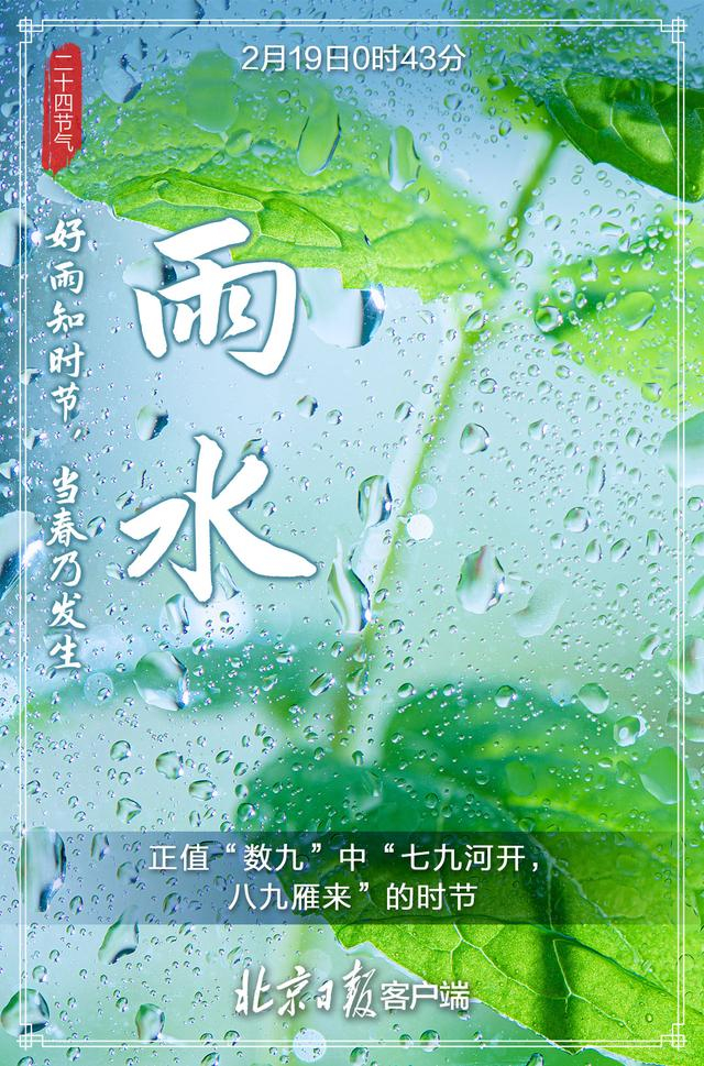 2月19日,迎来雨水节气。这是二十四节气的第二个节气。雨水和谷雨、小满、小雪、大雪等节气一样,都是反映降水现象的节气,是古代农耕文化对于节令的反映。