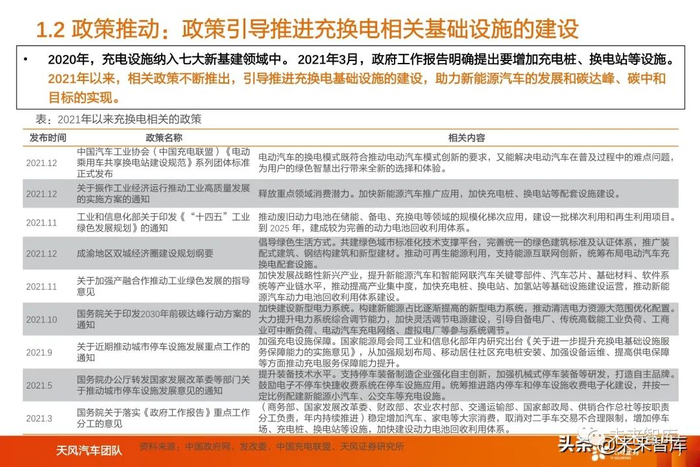 2020年,充电设施纳入七大新基建领域中。2021年3月,政府工作报告明确提出要增加充电桩、换电站等设施。2021年以来,相关政策不断推出,引导推进充换电基础设施的建设,助力新能源汽车的发展和碳达峰、碳中和 目标的实现。
