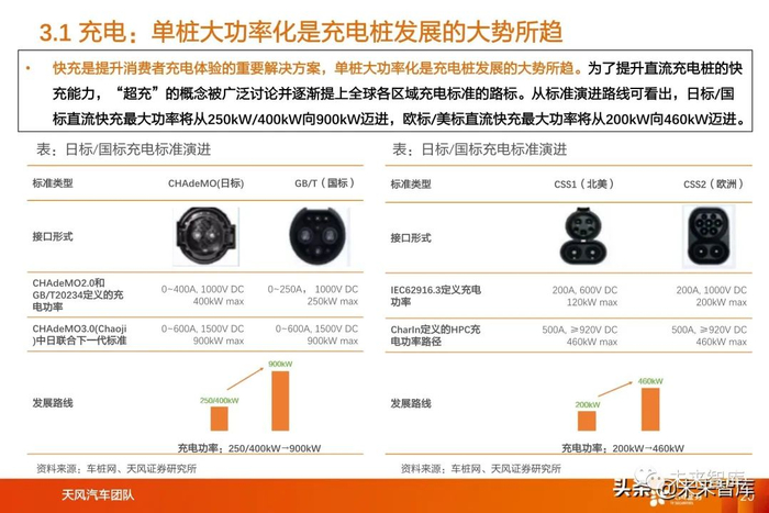 快充是提升消费者充电体验的重要解决方案,单桩大功率化是充电桩发展的大势所趋。为了提升直流充电桩的快 充能力,“超充”的概念被广泛讨论并逐渐提上全球各区域充电标准的路标。从标准演进路线可看出,日标/国 标直流快充最大功率将从250kW/400kW向900kW迈进,欧标/美标直流快充最大功率将从200kW向460kW迈进。