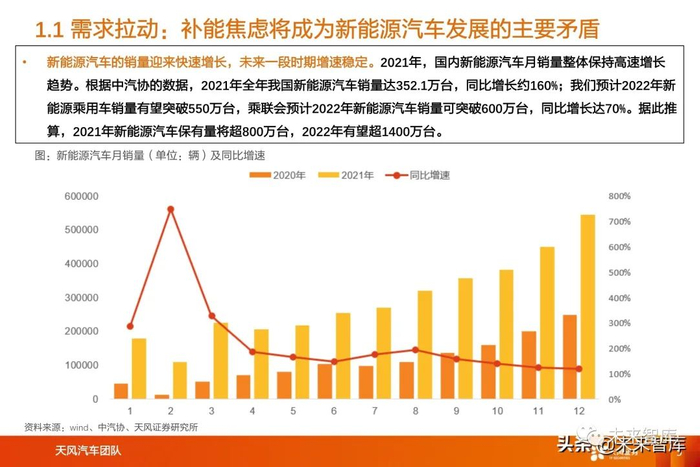 新能源汽车的销量迎来快速增长,未来一段时期增速稳定。2021年,国内新能源汽车月销量整体保持高速增长 趋势。根据中汽协的数据,2021年全年我国新能源汽车销量达352.1万台,同比增长约160%;我们预计2022年新 能源乘用车销量有望突破550万台,乘联会预计2022年新能源汽车销量可突破600万台,同比增长达70%。据此推 算,2021年新能源汽车保有量将超800万台,2022年有望超1400万台。(报告来源:未来智库)