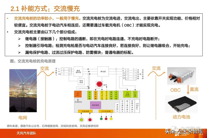 交流充电桩的功率较小,一般用于慢充。交流充电桩为交流电进,交流电出,主要依靠开关实现功能,价格相对 较便宜。交流充电桩于电动汽车相连后,还需要通过车载充电机(OBC)才能实现充电。