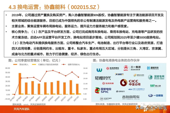 对于运营商而言,由于换电模式成本高,投资大,企业要面对较高的财务压力,因此同样也更适合规模化的运营 场景。如北汽新能源与奥动合作的换电站,目前主要客户群体为出租车和运营车;协鑫能科自2021年10月起陆 续投入运营的换电站,主要也是围绕重卡、出租车和网约车开展换电业务;吉利和力帆也成立了合资公司,将推 出换电出行新品牌。