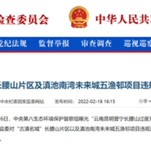 2月18日,中央纪委国家监委网站发布《云南通报“古滇名城”长腰山片区及滇池南湾未来城五渔邨项目违规违建问题追责问责情况》指出,经云南省委批准,决定对“古滇名城”长腰山片区及滇池南湾未来城五渔邨项目违规违建问题相关责任单位和责任人严肃追责问责。