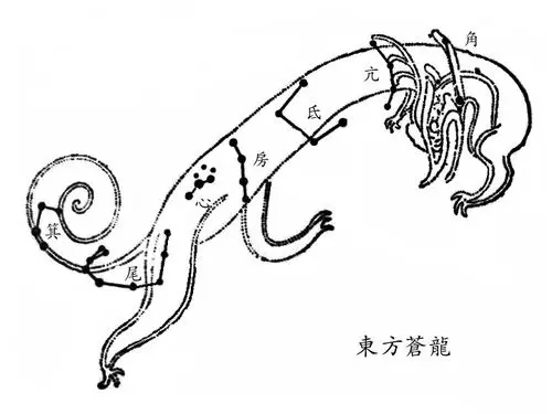 自太古时代,苍龙七宿的出现就在中国先民的心目中有着重要的意义。根据太史公司马迁的记载,一年四季可以用天空中北斗的斗柄指示的位置来确定。当斗柄指向东方时,天下就是春季。沿着斗柄的方向延长30度左右,将会看到一颗非常亮的星,这颗星被称为“大角”,顾名思义,它在古代被认为是苍龙星宿头上的那只利角(古人角宿从大角算起)。沿着大角再向前30度,就会看到角宿。斗柄指东,角宿开始上升,春季因此到来。所谓的“龙”也就渐渐出现在田野之上。