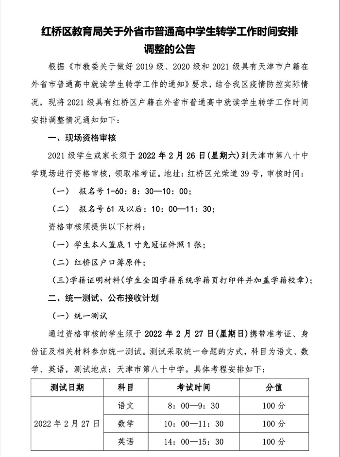 根据《市教委关于做好2019级、2020级和2021级具有天津市户籍在外省市普通高中就读学生转学工作的通知》精神,结合我区实际,最新工作安排如下: