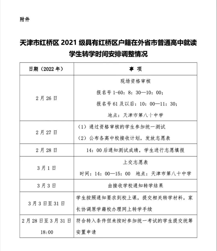 符合转学条件但因故未参加统一测试的学生,须于2022年3月31日18时前,携带相关材料到河北区教育局报名,通过资格审核后,结合区内普通高中学位情况进行统筹安置。