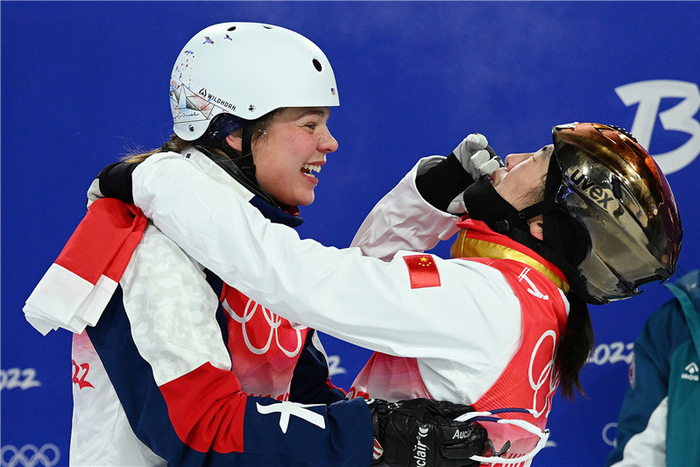 美国选手阿什莉·考德威尔与中国选手徐梦桃(右)拥抱,祝贺徐梦桃在北京冬奥会自由式滑雪女子空中技巧决赛中夺冠。