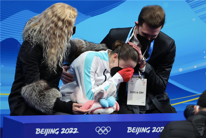 2月17日,在北京冬奥会花样滑冰女子单人滑自由滑比赛候分区,教练安慰着伤心的俄罗斯奥委会选手卡米拉·瓦利耶娃(中)。