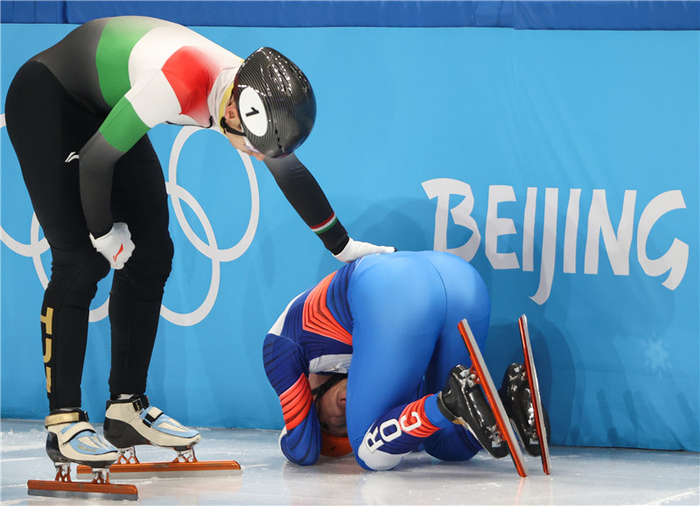 北京冬奥会短道速滑项目男子1500米决赛后,匈牙利选手刘少昂(左)在安慰俄罗斯奥委会选手西蒙·叶利斯特拉托夫。